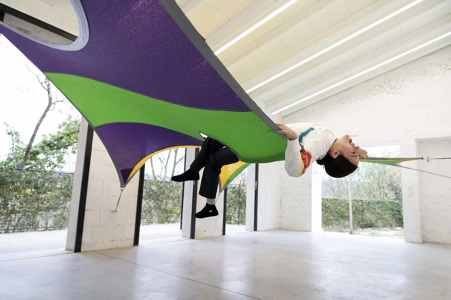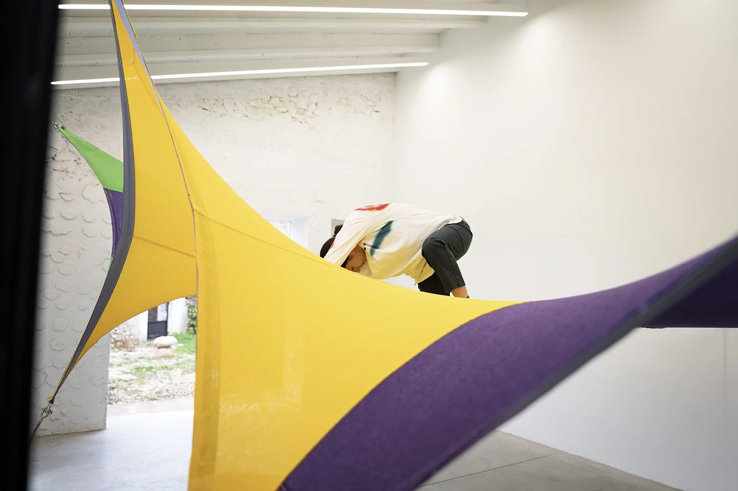 Laia Estruch. KITE, 2022. Performance. Custom-made shade sail and accompanying hard- ware. 7.90m x 4.05m x 2.40m.